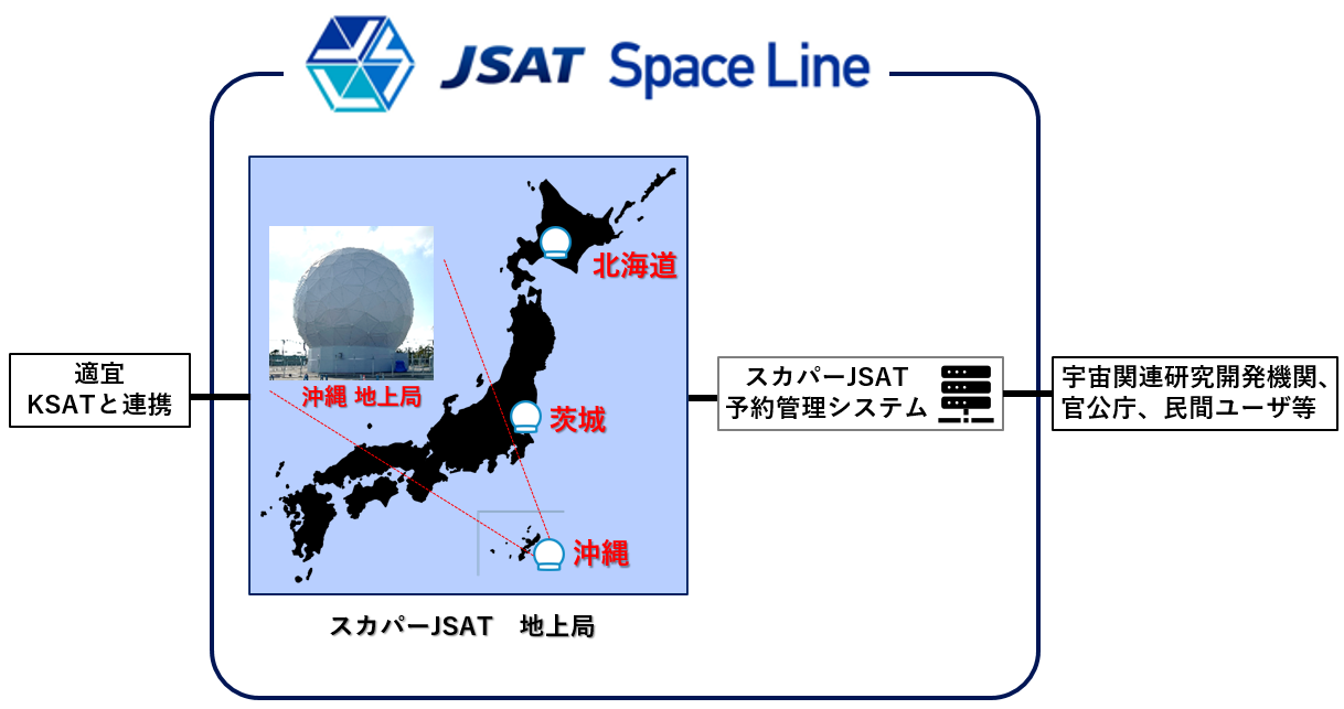 『JSAT Space Line』は、スカパーJSATが保有する国内3拠点(北海道、茨城、沖縄)の地上局と業務提携先であるKongsberg Satellite Services社(以下KSAT)所有の2拠点の海外地上局と連携し、低軌道のほか、静止軌道や静止軌道以遠の衛星の追跡・監視・制御を行うサービスです。 本サービスは、JAXAとの協定に基づき、KSATと共同で構築を進めてきたJAXA向けサービスを、民間向けに展開したものです。国内外の地上局を通じて24時間365日、安定的かつ継続的に衛星の追跡・監視・制御を行うほか、専用システムからの予約により、必要な時に必要な局を柔軟に利用いただけます。